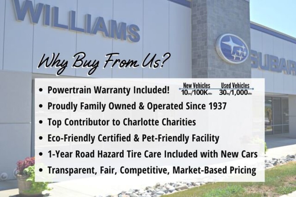 Enjoy an included 10 year/100,000 mile Powertrain Warranty and free 1st scheduled maintenance on this new Subaru from Williams Subaru! Plus take advantage of 1 year complimentary road hazard protection. *WRX, BRZ, and electric vehicles are ineligible for complimentary powertrain warranty. Contact us for complete details.